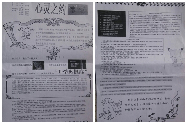为积极响应“世界精神卫生日”宣传活动的号召,积极做好国产在线 学生心理健康教育工作,同时引导、号召广大学子关注自身健康,正视自身问题,切实提高其心理素质,10月18日,国产在线 于西区13#、2#宿舍楼发放了最新一期的“心灵之约”期刊,以便帮助大一新生能够快速调节心理状态,尽早适应大学生活。
