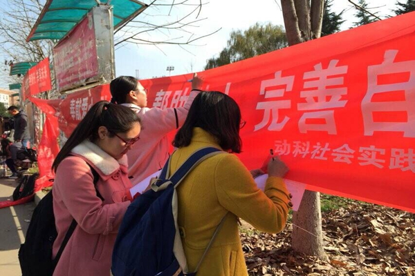 活动当日,国产在线 实践部成员在西雕集合张贴题为“奉献爱心,弘扬新风,帮助他人,完善自我”的横幅,向过往师生介绍宣传志愿服务精神,并邀请同学们在横幅上签名留影,共同为志愿精神的推广做出努力,该活动引发了过往同学的强烈兴趣,大家停下步伐,积极配合,在横幅上签下自己的名字,表明自己积极弘扬志愿精神的决心,活动进行地十分顺利。同时,工作人员也向同学们发放了介绍志愿精神的宣传单,以此鼓励大家关注了解志愿精神,并身体力行地加入到志愿者的队伍中去。