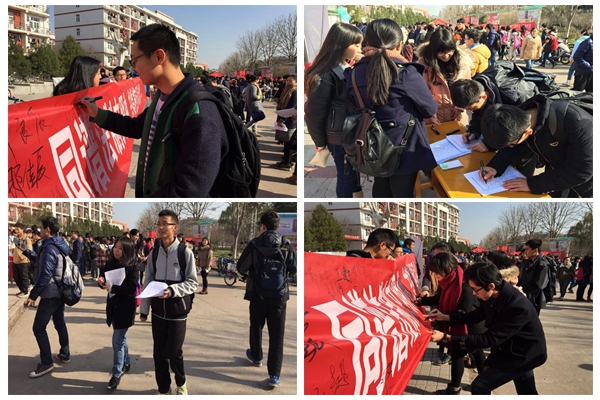 活动前期,志愿者们向国产在线 14及15级同学发放调查问卷,了解当今大学生的法律意识及知法程度,并以此为依据制作法制宣传页,为后期法制宣传相关活动做好铺垫。“一二·四法制宣传日”当日,志愿者们分发宣传单,并邀请过往同学在写有口号“共谱法制宣传曲,共唱和谐校园歌”的横幅上签名,呼吁大家提高法律意识、加强法制观念。极具号召力的宣传语以及志愿者们详尽地介绍吸引全校各院各级过往同学驻足,大家积极了解参与到活动中来,在横幅上签下自己的名字,表明自己将积极支持普法活动,努力参与建设法制校园的决心。活动现场气氛热烈,同学们纷纷表现出对构建法制校园维护自身权益的渴望。动科152班韩萌萌同学表示:自己将在今后的学习生活中坚定自己的立场、敦促自己的言行,为法治校园奉献自己的一份力。