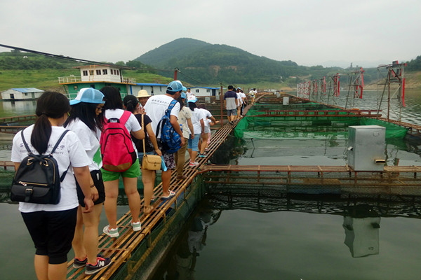 古朴的建筑和悠久的文化底蕴给小镇增添了浓厚的历史感,调研服务队沿铺满青石板的小路到达瀛湖边坐船,船儿前进在潺潺山水间,清澈的湖中出现一片网箱,“莲花餐饮集团,水产有机养殖垂钓中心”矗立其中。在当地渔民的指引下,队伍沿网箱参观鱼苗养殖情况,渔民一路上对调研队员们介绍鱼苗的生长情况,队伍沿着网箱考察学习,提出问题,记录答案。队员们对品种多样的鱼苗和自然有机的生长环境留下深刻印象。队员陈晓鸿表示,“渔民们使用的机械自动投食是队员们课堂上学习到的知识,在今天亲眼见到后,对其有了更深入的了解。”