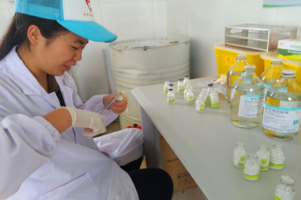 活动伊始,队员们穿戴规定的工作服及防护工具,进行全身消毒后方可进入牛室,队员们跟随兽医站的工作人员检查各个牛棚中奶牛的健康状况。一切就绪后,队员们在工作人员的引导下进入兽医站,兽医站内主要存放一些药品和手术器械等各种工具。负责人付师傅表示,兽医站最主要的工作还是医治患病的奶牛及疫病的防治。当天医护人员准备给部分患病奶牛输液,队员们主动要求协助医护人员,在专业老师的指导下初步尝试进行药物的配置,随后跟随老师进入牛室对牛进行颈静脉注射。牧场的栏杆有设计巧妙的结构用以固定住牛身,为牛的注射工作提供了便利。