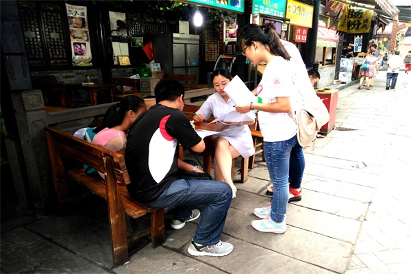 成都文殊坊“非物质文化遗产•手工技艺主题街”是成都首条非物质文化遗产手工艺主题街区。活动前期,队员们进行了充分的调查准备工作,了解到这条街汇集了蜀绣、蜀锦、羌绣、漆器、银花丝、竹编、苴却砚、剑杖等多种多样的非物质文化遗产•手工技艺,更有道安,宋西平等中国传统手工技艺大师坐镇其内,是开展中华传统文化调研的最佳场所。在清楚文殊街基本状况之后,队员们兵分三路,于不同地点、针对不同人群就人们对外来文化冲击中古传统文化的看法展开了问卷调研。在居民们的积极配合之下,队伍顺利完成了当天的调研活动。在对调研结果进行比较后,大家发现文殊街的居民们较成都其它街区的居民们而言,对外来文化冲击中国传统文化的现象显得更为包容。在文殊坊卖纪念品的曹大爷说:“我并没有觉得外来文化会消灭本地传统文化,文化是一直在发展的,中华文化要想源源不断的发展,就需要不断包容、改进、融合,外国文化能够带给大家无限的创意,因此,对于外来文化,我们应该去其糟粕,取其精华,而不是一味的盲目的排外。”此次的调研,令队员们感触极深,帮助大家对外国文化有更加客观全面的认知,使同学们能理性客观的看待一带一路给经济所带来的影响和转变。