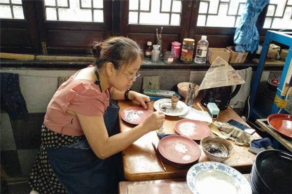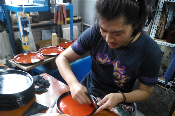 学徒在为漆盘上漆
