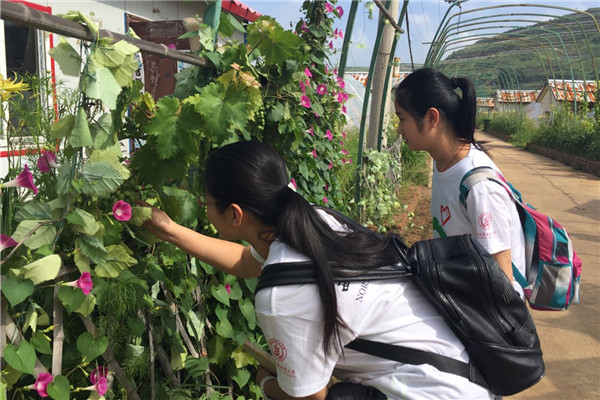 古交市关头村是著名的红色老区,这里的农业体验基地也集中体现了红色老区在农业现代化发展上的情况。村里的农业基地是农业部蔬菜标准园,面积270亩,年产无公害蔬菜3400吨,主要的种植品种有草莓、甜瓜、西红柿等。据工作人员介绍,大棚内采用水肥一体化技术,并使用了诱虫板、杀虫灯等现代化科技。这里采用穴盘育苗来种植作物,还会定期引进新品种进行培育种植。在工作人员的带领下,同学们进入了大棚,亲身体验了现代化的农业科技。虽然使用了很多现代化的技术,但是大棚内空间狭小,无法使用大型机械,所以大部分作物都是按原始方式进行种植的。队员们也在大棚内体验了除草、耕地这样的工作,虽然时间不长,但是也深深地体会到了农民伯伯的艰辛。