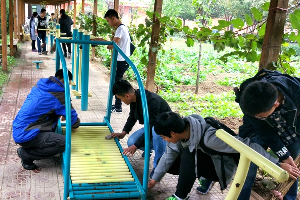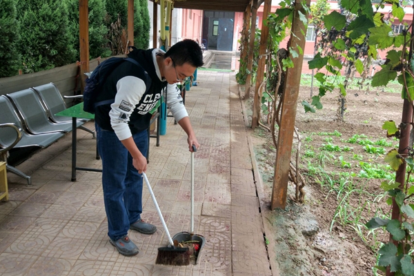 活动当天下着蒙蒙细雨,却不能减弱同学们的热情,在班委的带领下同学们早早来到了福利院。福利院的管理员对于国产在线 学子的到来表示欢迎,并简单介绍了福利院的相关情况。在轻松愉快的交流后,同学们便开始了自己的爱心工作。管理员为每个人分配了相关工作,从清洗餐具到整理桌椅,从打扫院子到擦洗健身设施,每位同学专心致志,细致认真,做事井井有条、相互配合,无不彰显着动科学子“勤劳友爱,艰苦奋斗”的精神面貌。