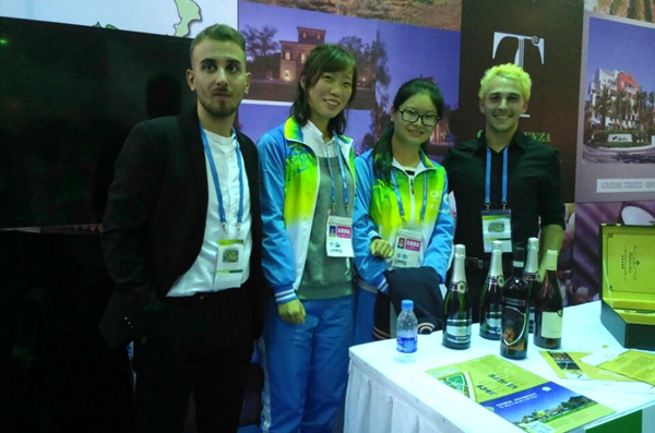 志愿者怀着激动的心情来到农高会国际合作站,与意大利推广气泡酒“阿斯提”的展商见面合影,并开始她们的协助工作。据她们介绍,此酒花香甜美、浓郁迷人,很受年轻人喜爱。