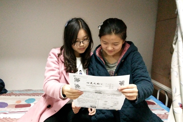 同学认真阅读“心灵月刊”