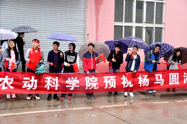 在比赛当日,不仅有60名志愿者来到比赛现场,动科国产在线 学生会、各班级也有众多同学积极参与到此次马拉松比赛中,众多同学在赛道两侧挥舞着国旗,头绑红色印有西农字样的条带,贴着印有校徽的贴纸,为参赛者鼓劲加油。尽管雨滴打湿了志愿者们和同学们的衣服,却没有浇灭他们服务于参赛者的热情。
