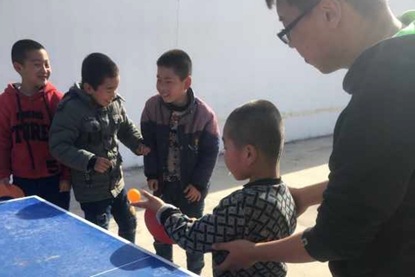 志愿者教小朋友打乒乓球
