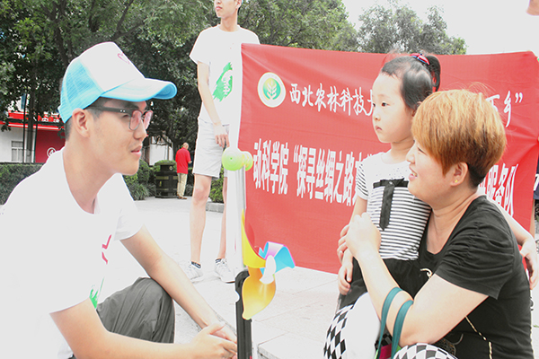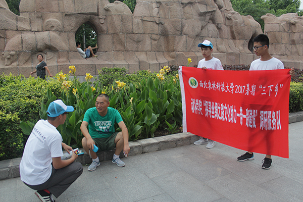 下午六时,队伍到达群雕附近,看到公园内有着大量的居民——有带孩子乘凉的妇女,有放风筝的老者,有在雕塑上攀爬玩耍的儿童,有结伴而行的夫妇……队员们将第一个采访目标定为了一对正坐在台阶边的母女。说明来意之后,采访人员先对小姑娘问了几个关于丝路文化知识的小问题,其中大部分孩子都不太清楚。孩子母亲告诉队员们,平时带孩子来群雕只是为了散步乘凉,而不会想起群雕所代表的历史,又因为孩子还小没有学到过相关知识,所以对丝路文化不太了解。随后在对孩子母亲的采访发现孩子母亲对丝绸之路文化也知之寥寥。采访结束后,同学们将自己制作的宣传单发给了那位母亲,并给小姑娘赠送了西农明信片。离开时队员们看到,那位母亲正拿着宣传单给孩子认真的讲述上面丝路文化的内容。整个采访进行了两个多小时,采访对象从老人至孩童共50人次,其中包含拒绝了同学们采访请求的部分居民。队伍副队长、动科国产在线 辩论队成员赵铭峣同学在活动结束后表示:“今天是我的第一次采访,和打辩论赛不同,真的很紧张,而且被别人拒绝时也感到很尴尬,不过适应了便有勇气继续寻找下一个人。个人非常享受这个过程。”
