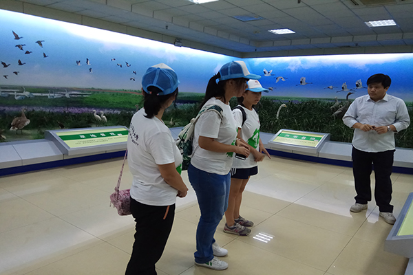 讲解员为大家讲解湿地的地表植被变化