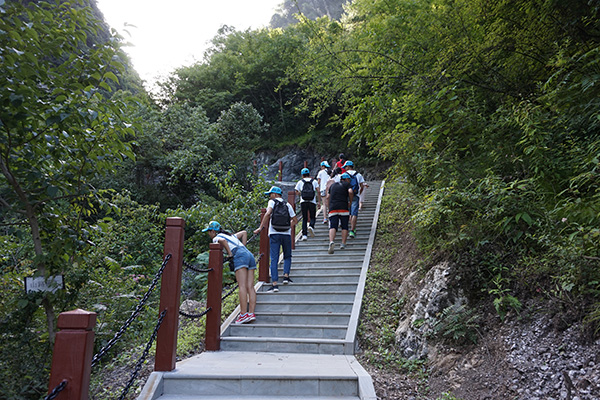 伴随着歌声和笑声行走在山路上