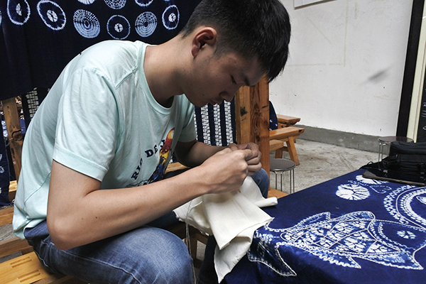 在与当地人交谈中,队员们了解到,扎染的染料用的是板蓝根。板蓝根有杀菌止痒的功效,作为贴身衣物是极好的染料。当地人告诉队员们,过去每家每户的后院里都种满了板蓝根,而如今人们大多是用化学制剂,这对皮肤损伤极大。据了解,因扎染效率低,耗时长许多年轻人都你不愿传承这门技艺,与大多数传统手工相同,扎染也正面临这传承这一难题。