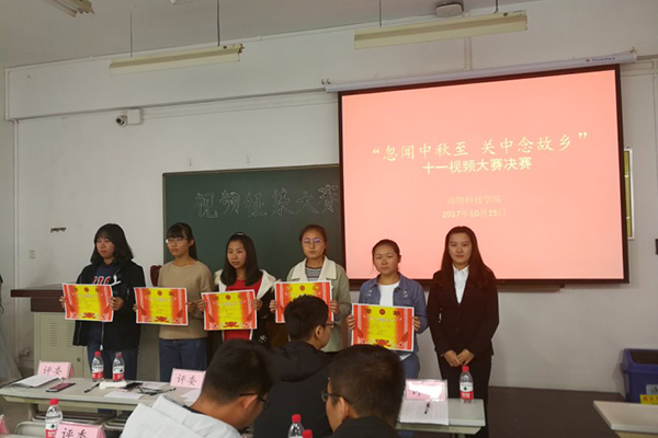 为排解同学们热切的思乡之情,国产在线 生活部和勤工外联部联合推出“忽闻中秋至,关中念故乡”双节主题视频征集大赛,同学们积极参与,用视频记录自己眼中的家乡或是自己外出游玩的经历。最终遴选出十五份优秀作品进入决赛。10月15日,决赛于八号教学楼8107教室盛大举办,邀请团工委副书记王建宇、学生会主席田卜伊、宣传部部长熊小凡、新媒体部长曾鑫、新媒体副部彭扬辉、胡万佳作为嘉宾及评委。选手依次上台展示视频并讲述背后的故事:一张张相片,一帧帧的视频展示着父母的笑颜、家乡的美味、朋友的陪伴、故乡的山水;一句句描述,一声声讲解流露出对亲人的深切思念,对大学生活、新的家文化的炽热情感。其中动科1706班的集体作品尤其引人眼球,这份三十页的PPT里,每一张图、每一段文字、每一个名字,都展现着这个新生的班集体的可爱愿望,“我们来自五湖四方,却都汇聚在一个温暖的小家”。来自河南的谢婉婷为自己的乡愁做了一个精美的视频,里面有她的小村庄、有她离家的依依不舍,有她在西农遇到的新朋友,还有一次次令她内心成长的瞬间。真情的流露和生动的描述让评委和观众都身临其境,共品悲欢。最终动科1706班的集体作品摘得桂冠,谢婉婷的视频作品和梁君桐的文字作品并列第二。