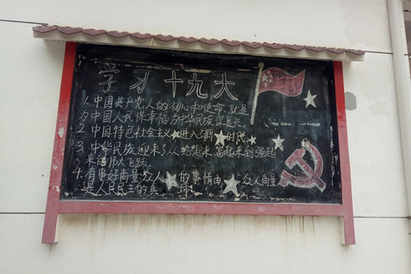 活动开始前队员们在与汤主任的沟通中了解到十九大精神的宣传是最近工作的重中之重,而黑板报则是最为有力的宣传方式之一。在队员们到达汤家村村委会之后,队员们和村委会成员一起讨论了黑板报的内容和板式问题。最后结合村干部意见和提供给队员们的资料,队员们开始了绘画工作。队员们首先将十九大报告中关键词和新提法工整地写在了黑板上,由此可以让村民在第一时间就了解到十九大的新思路,学习到十九大的新精神。黑板报上队员们还画上了党旗和党徽,小小的黑板因为有了鲜艳的党旗和党徽而显得愈发引人注目。并且还引来了旁边围观的小朋友的阵阵掌声。在队员们绘画完成后并请汤主任来验收时,更是得到了汤主任对队员们一丝不苟的工作精神和助力乡村精神文明宣传的志愿服务精神的表扬。汤主任还强调大学生要走出书本,多多关心国家大事,做到家事国事天下事,事事关心。队员们也表示作为田园使者理应为乡村发展做贡献,在得到村民和村干部的认可后,队员们也定会牢记初心,努力把田园使者做的更加出色。