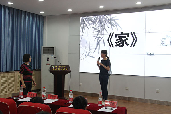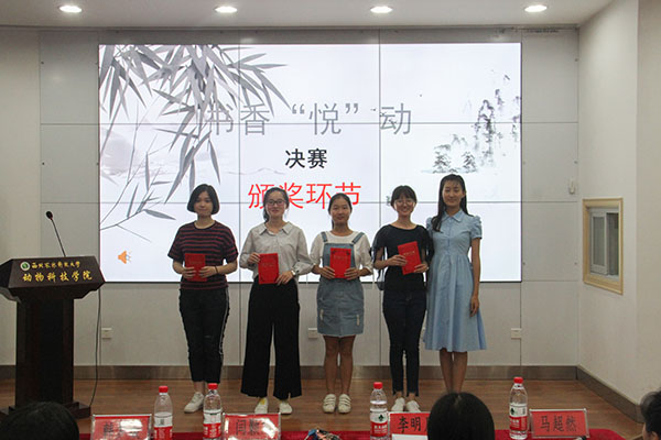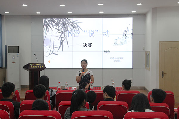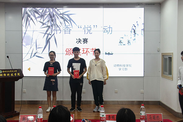 本次决赛共分为“知识竞答”、“你划我猜”、“书海采撷”三个环节。在第一环节中,从金戈铁马,到琴棋书画;从大漠孤烟,到水墨江南;从忠肝义胆,到千里婵娟。参赛选手们展现出了良好的文学功底,凭借其渊博的知识储备和睿智的作答,赢得了现场观众阵阵掌声。比赛如火如荼地进行着,在紧张激烈的“知识竞答”之后,有趣的“你划我猜”环节拉开了帷幕。选手们默契配合,动作幽默诙谐,方法多种多样,台下观众的欢笑声不绝于耳。随后,“书海采撷”环节上演,选手们利用制作精美的PPT,缀以简明得体的语言,一一介绍自己所读过的书籍,分享自己的经历与感悟,引起了全场的强烈共鸣。动科1702班郑祎宁同学说到:“以前在高中时,学校举办了许多类似这次读书比赛的阅读经典活动,在校园里掀起了学习古诗词的热潮,中央电视台推出的《中国古诗词大会》更是激发了全民阅读的热情。希望在大学的校园里,每个人都能坚持阅读,充实自己。”