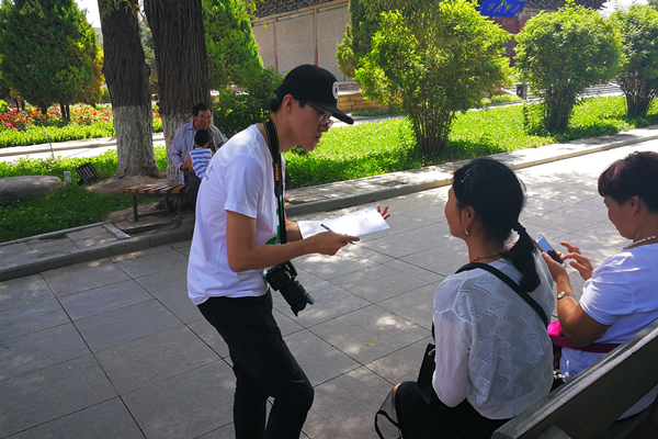 接下来小队成员还对讲解员老师进行了一番采访。老师表示:自己是文博专业出身,对这里的藏传佛教与本土佛教的汇合而形成的独特文化风格有着浓厚的兴趣,因而选择来张掖大佛寺进行实习。而当被问及对于当下旅游景区文化遗产保护工作困难重重这个问题的看法时,老师表示这的确是他们这些工作者非常在意的一个问题。但随着近几年这方面的政府宣传力度加大、规章制度的逐渐完善,故意破坏文物、间接损害文物等状况的发生频率有所下降,旅客的素质也都有明显提高,情况较往年好了很多,这令他们感到十分欣慰。