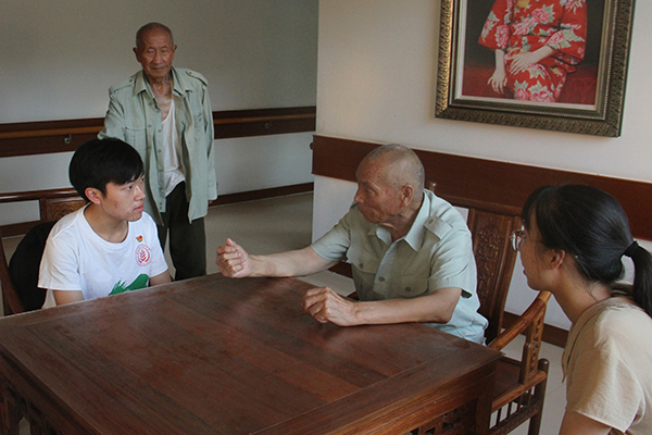 “你们是大学生吧!”正在队员们准备进屋时,身后突然传来了浑厚有力的声音。一位面容坚毅的老兵在身后叫住了队员们,并热情的拉着大家围坐在大厅中的桌子边,开始讲述他的故事。同京飞老人已年逾90,身着军装,腰板挺直,声音浑厚,口中吐出的是70年前那段烽火岁月……“日本人有飞机,打到最后我们全连只剩6个人,但是大家还是拼到了最后走一刻。”1942年,同京飞跟随部队奔赴山西抗战前线,并在惨烈的战斗中英勇作战。抗战胜利后,国民党大局进攻陕北,在与胡宗南部的战斗中,他曾与战友在战壕里三天三夜滴水未进。“只要是想起牺牲的战友们我就伤心,天天说话玩耍,一场战斗之后可能就没人了……但是我们也从未害怕过,老百姓想要过上好日子,就要先把敌人赶走!”说到动情处,老人眼里泛着泪光。听闻队员们来自国产在线 ,老人更加精神了,原来他的孙子正于我校攻读硕士研究生。“你们年轻人,大学生,一定要好好读书!将来造出比国外更先进的飞机导弹,我们国家才不会被欺负!看到现在许多年轻人在大学不好好读书,只知道上网打游戏,我就心痛啊!”队员唐红玉急忙紧握住老人饱经风霜的手说:“爷爷您放心吧!我们一定会好好读书的!”老人也欣慰地笑了。