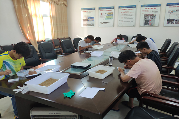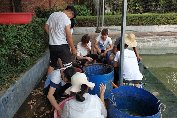 纸上得来终觉浅,绝知此事要躬行。调研队队员于8月7号上午顶着炎炎夏日同水产站工作人员一起前往鱼塘体会实践操作,在工作人员的指导之下,队员们帮助工作人员对鱼塘进行拉网和收网工作,此后帮助工作人员们一起就网上来的鱼进行分类统计,了解鱼塘生态系统组成,为下一步的鱼苗投放打下数据基础。8月8日,为促进水产站的试验项目建设,队员们协助水产站科研人员进行黑水虻的采样以及幼虫统计,黑水虻为腐生性的水虻科昆虫,能够取食禽畜粪便和生活垃圾,是高价值的动物蛋白饲料,通过采样和统计,能够进一步得到更高质量的鱼类饲料。在这些过程中,调研队同学深深的体会到了工作人员的辛苦,但同时也收获了实践的经验,为此后的实习铺下良好的基础。虽然在实践的过程中队员们各方面的能力尚未完全成熟,但是也在一步步中通过实践提高自己。