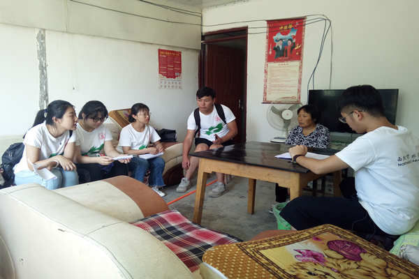 爬了一段陡坡,看见一处孤零零的住房,一位老爷爷拄着拐杖,颤颤巍巍地站在远处。村书记告诉队员们,这就是任光明。队员们扶着任爷爷进屋坐下,听他艰难地讲述了自己的家庭情况。任光明一家五口人,两个女儿均为残疾人,外嫁到了临近的镇上,儿子外出打工很少回家,家中只有两位老人。久病缠身,任爷爷已无法料理自己的生活,家中的所有事情全靠老奶奶操劳,医药费的花销占了生活开支的大部分。扶贫政策出台后,医药费的百分之九十由扶贫部门负责,给任爷爷一家减轻了许多负担。任爷爷表示十分感激政府的帮扶政策,给自己的生活带来了极大的帮助。村书记告诉队伍,医药费的负担,子女赡养义务的缺失,是导致任光明一家生活贫困的主要因素。