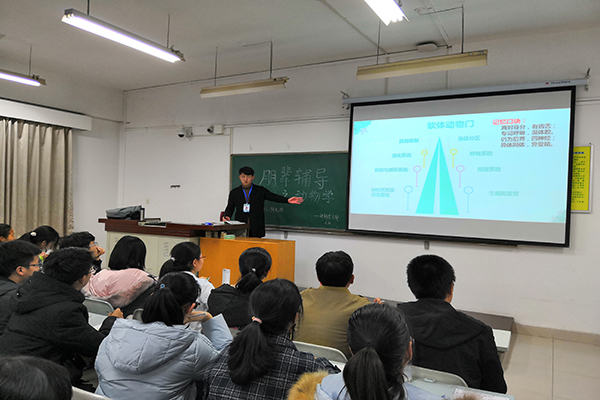 接着,他便从“绪论,动物界各门,脊椎动物各纲”这三个方面对课本知识做了体系化的复习,期间他结合自己的学习经验,运用生动形象的比喻对一些难理解的知识点做出了详细的解释,让同学们豁然开朗。此外,他还给大一新生分享了他大一时总结出的重要的名词解释,而且为了方便记忆,他还向大家推荐了自己总结出的简易记法,让同学们有了新的思路。