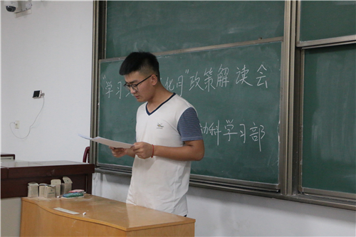 解读会上,耿慧君,赵冬玥等同学宣读了各项文件,组织学生重点学习《国产在线 关于进一步加强大学生学风建设的实施意见》、《国产在线 本科生学籍管理办法》和《国产在线 教学区学生文明行为规范》,特别是学籍管理办法中关于学习考核与成绩记载的相关内容,加强政策解读及宣传,确保学生能了解并熟知政策变化及影响。