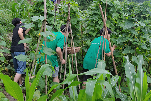七月的汉中正值充沛的雨季,今日亦是如此。清晨赴西沟村的队员们在讨论过针对当地情况所要问的问题后,开始拜访已联系好的附近村民,村民们都十分热情,认真回答问题,对来这里调研的队员们表示欢迎。经过了解后,西沟村的老人和留守儿童较多,主要以个体自给自足的小规模农业经济为主,农作物主要是水稻、玉米、山药、茶叶等,家畜主要是鸡、鸭、猪等,该村以山药、茶叶、黑毛土猪为特色。在询问当地村民相关问题后,在征得村民同意的情况下,赴西沟村的队员们下地采摘黄瓜和四季豆,亲身体验收获农作物的乐趣,同时了解到干农活的不易。在一上午的走访后,西沟村的农业生产情况已不甚明了。虽然各家各户都种植农作物,但农业技术水平较低,小型农业发展十分缓慢,当地农村的经济发展也由此受到明显的制约。