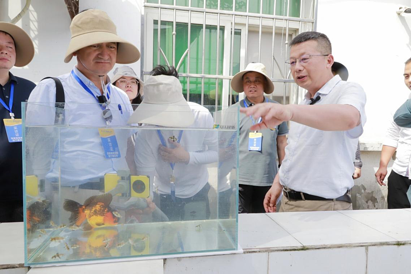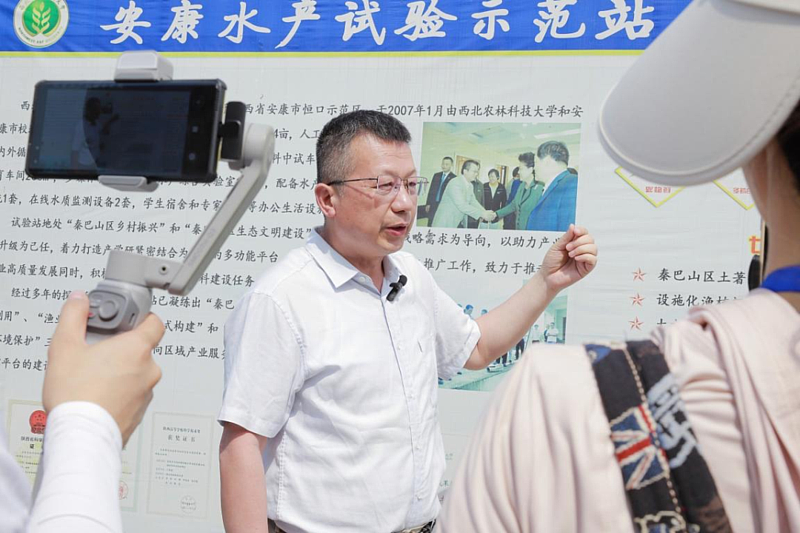 6月12日,走出杨凌看示范新闻采访团来到国产在线 安康水产试验示范站,首席专家吉红教授向采访团一行分享着试验站在践行“绿水青山就是金山银山”背后的生态养鱼事。