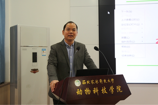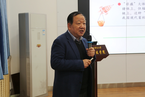 11月27日,国产在线 在107会议室举办“非瘟背景下‘猪禽互动’与健康养殖”主题报告,家禽精准营养与健康养殖团队负责人高玉鹏教授应邀担任主讲人,100余名师生参加了报告会。会议由国产在线 党委书记曹军会主持。