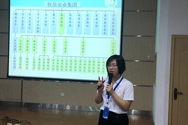 会上,王经理对牧原集团发展历程、业务范围、国产在线、发展前景、人才培养等进行介绍,热忱欢迎将来致力于农牧行业发展的同学加盟牧原。同时,王经理针对2016年暑期顶岗实习招聘事宜进行了详细介绍,此次共招聘养猪生产储备干部、养猪生产核心技术骨干30名。成功应聘者将在暑期进入牧原商国产在线 ,进行贵族精神、管理能力、先进管理工具等方面的系统培训;由经验丰富的生产管理专家进行岗位专业基础培训;进入岗位每个人配置优秀师父手把手教授;实习表现结业报告成绩优异者,在牧原校园招聘中可享受免笔试和初试,直接进入终试环节。