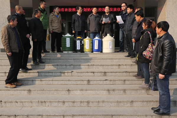 昝林森教授主持发放仪式并致辞,他首先介绍了项目执行情况和对产业的提升带动作用,并就发放奶牛性控冻精的目的意义及这次发放的从美国进口的荷斯坦牛性控冻精的系谱资料、使用方法、注意事项等做了重点介绍。随后,推广处吴锋副处长在讲话中再次强调要充分发挥陕西省重点农技推广项目的作用,按三个层级开展技术研发、集成示范和辐射推广,做好技术链的打造和产业链的拓展,全力打造新型技术研发示范推广模式。姚军虎院长讲话时表示,各项目承担单位一定珍惜这批进口的高产荷斯坦奶牛性控冻精,并按照项目组提供的配套技术保存好、使用好,做好选种选配和后代的选留、养殖工作,充分发挥技术辐射和带动作用。