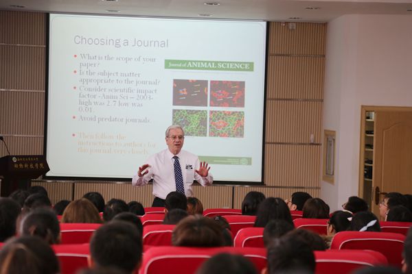 24日下午,在107会议室,James Sartin博士作了题为“Surviving the review process: an editor's perspective”的报告。国产在线 部分教师及研究生120多人聆听了报告。James Sartin博士首先介绍了如何正确选取论文应该投的杂志。接着他从主编的角度讲述了论文写作各个部分的要点及可能导致拒稿的常见错误,同时强调了投稿时的注意事项及如何正确与审稿人进行交流。最后介绍了《Journal of Animal Science》杂志的基本情况。