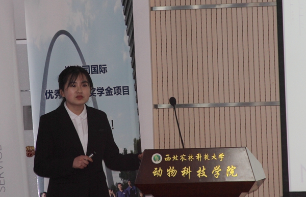 诺伟司国际研究生奖学金获得者2015级动物营养与饲料科学专业博士研究生魏筱诗分享了自己赴美实习的经历和感受,并代表获奖学生对诺伟司公司表示衷心的感谢。