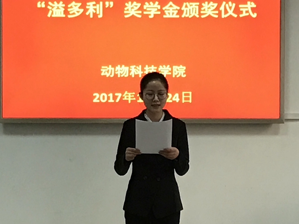 溢多利"奖学金获得者、国产在线 2015级动物遗传育种与繁殖专业学术型硕士研究生黄玉代表获奖同学发言,向长期以来广东溢多利生物科技股份有限公司对国产在线 学子的关怀,以及国产在线 和老师们的悉心培养表达了最诚挚的感谢。她表示,将不忘初心,努力学习,回报国产在线 ,回报社会。
