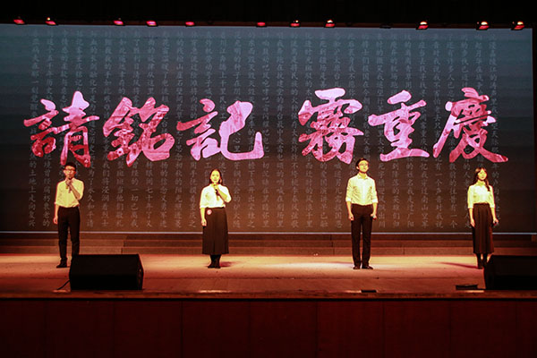 在精彩纷呈的节目表演与紧张激烈的知识竞答之后,校国旗护卫队的亮相引来了全场经久不息的欢呼。除了军姿训练表演外,国旗护卫队的成员们还为大家带来了朗诵《国旗下的誓言》,他们昂首挺胸,以激情澎湃的声音向大家讲述了“以我火红青春,捍卫国旗尊严”的骄傲与自豪。场下的观众无不为之动容,全场掌声雷动。