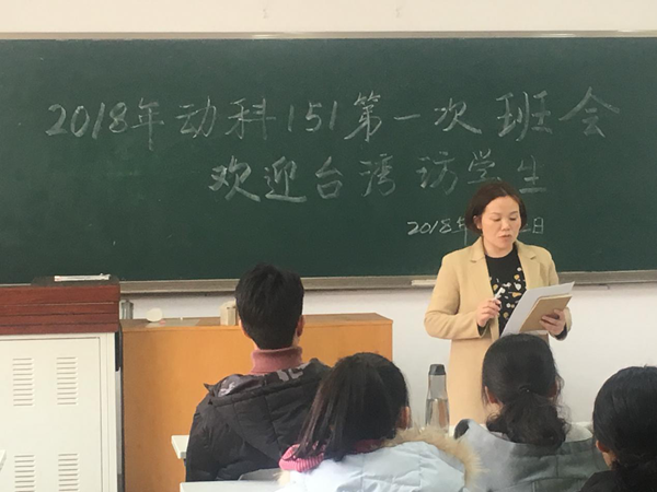 近日,动科151班2018年第一次班会暨台湾访学生欢迎会在N8303教室顺利举行。会议由班主任潘传英副教授主持,蓝贤勇教授和班主任助理周童出席了本次班会。