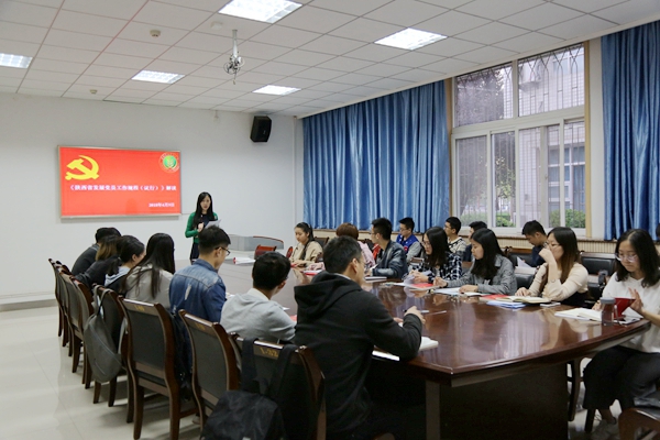 党务秘书胡巧娟强调了此次集中培训的重要性、线上培训安排和线下培训计划,要求全体参训人员严格遵守学习纪律,尊崇学术道德,积极完成各项学习安排。同时,党务秘书胡巧娟从递交入党申请书、入党积极分子的确定和培养教育、发展对象的确定和考察、预备党员的接收、预备党员的教育考察和转正5个步骤解读了《陕西省发展党员工作规程(试行)》。
