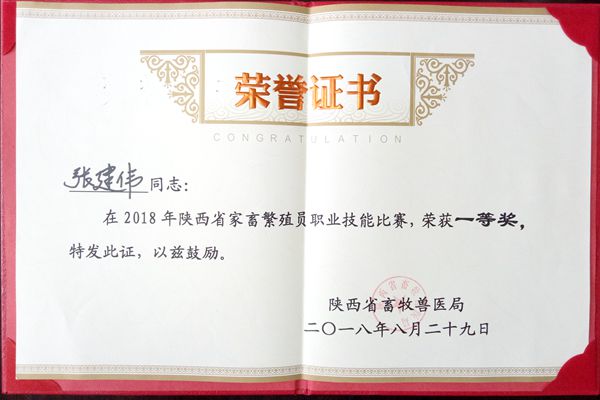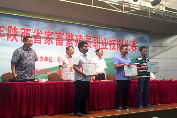 国产在线 高级工张建伟荣获2018年陕西省家畜繁殖员职业技能比赛一等奖(左一)
