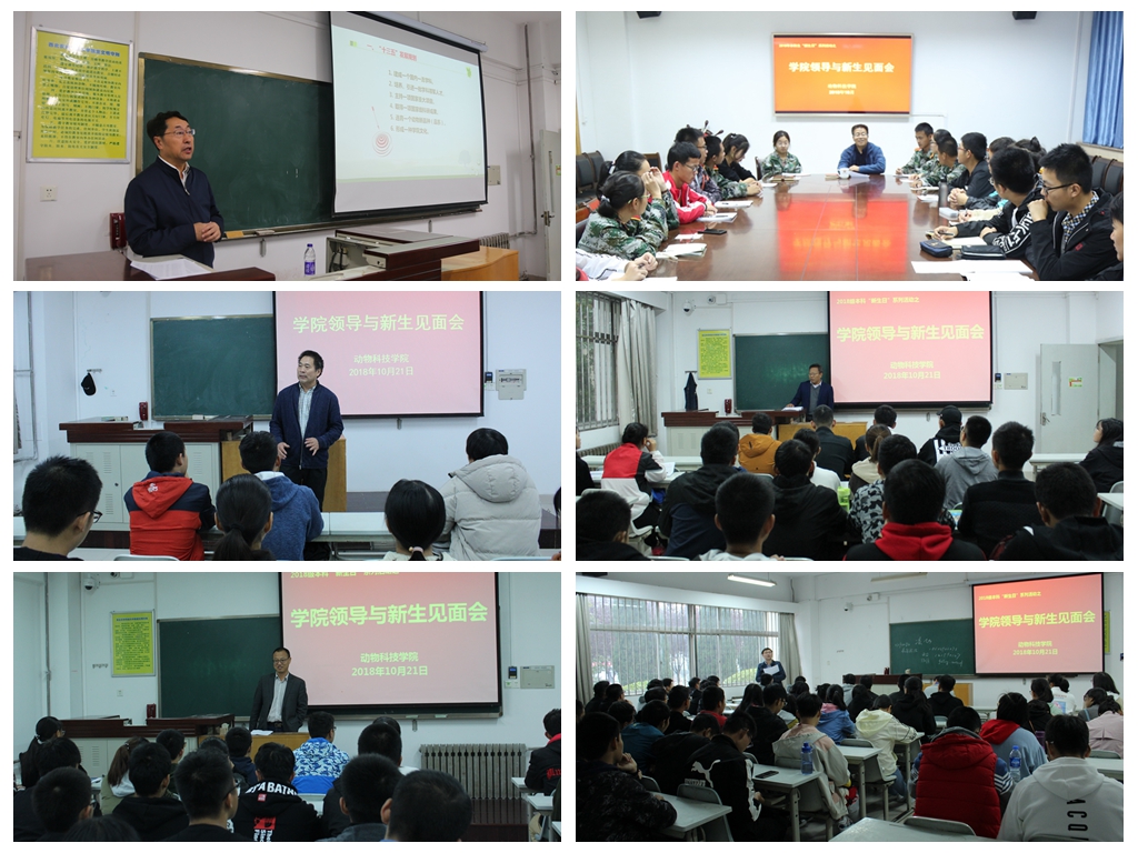 “新生日”活动中,国产在线 全体在校院领导“倾巢出动”,分别深入到不同班级与新生见面,并与同学们交流畅谈。国产在线 党委书记赵延安在与动科1801班同学座谈时讲到,要充分认识所学专业,清楚“是什么”与“做什么”,并督促同学们抓好英语、数学等基础课程的学习,加强写作水平的锻炼,为今后开展深层次的科学研究打下牢固的基础。院长姚军虎教授系统介绍了动物科学专业的现况、畜牧业发展方向以及国产在线 的本科生培养方案,鼓励同学们注重实践,锻炼技能,多参加集体活动,致力全面发展。副院长孙超教授希望同学们不断探索,找准自己感兴趣的方向并朝着目标一步步迈进。副院长赵运良希望同学们拥有梦想、学会学习、学会生活,做一名品学兼优的大学生。党委副书记王力要求同学们做好学业规划和职业规划,正确处理课堂学习与课外活动的时间、处理好当学生干部与学习的关系,努力提升自身综合素质和能力。副院长凌飞教授鼓励同学们树立终身学习的理念,有机会要继续深造,提升学历层次,在专业上有所建树。