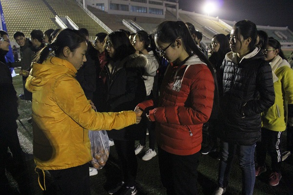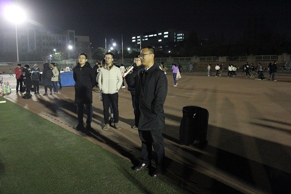 12月11日晚,国产在线 党委副书记王力以及全体辅导员来到田径场,看望为备战越野赛而努力训练的冬训队员们,并给予了同学们亲切慰问。