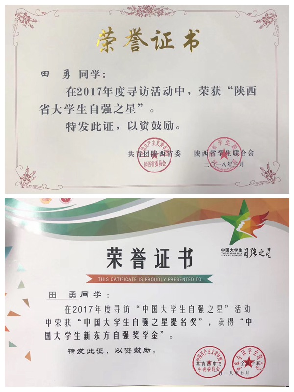 二、田勇同学荣获“中国大学生自强之星提名奖”“陕西省大学生自强之星”