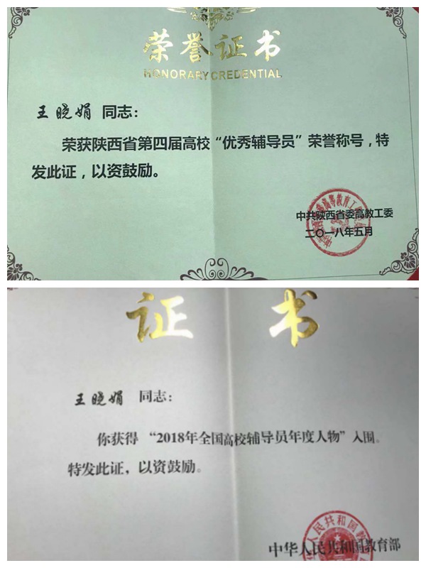 一、王晓娟同志荣获“第十届全国高校辅导员年度人物入围奖”“陕西高校优秀辅导员”