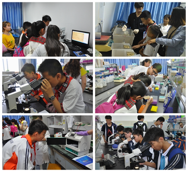 在实验室参观环节,博士研究生张鹏飞等用最通俗易懂的方式,向学生们介绍精密仪器的名称及用途,展示显微镜的基本使用方法,以及如何观察猪精子运动轨迹等,让同学们亲身使用移液器量取微量液体,观察组织切片。当学生们看到“会发光的”GFP转基因小鼠时,纷纷发出惊叹声,争先恐后地举手提问。