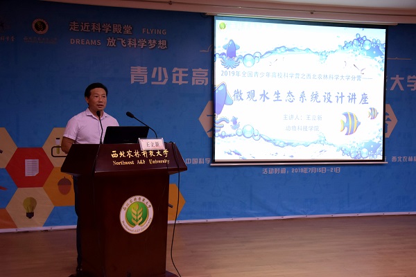 活动以由水产科学系王立新副教授带来的“微观水生态系统”讲座开始。主讲人王立新以图文并茂的PPT为主,生动有趣又富有科学性的讲解为辅,向高中生们展示了在日常生活中随处可见的水生态系统,同时阐述了其与人类生活紧密相连的重要性,随后他根据水族的设计过程分别衍生出制作方案的拟定、解决问题的方法、所需器具的使用等诸多章节,并对其进行了详细讲解。这堂结合了丰富图文和生动讲解的讲座,加深了营员们对于微观水生态知识的理解,进一步展现了微观水生态系统的奇妙魅力。