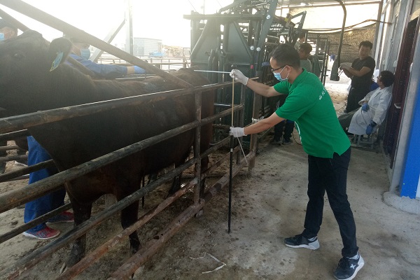 随后国产在线 队伍与新疆农业大学一行社会实践小分队前往该公司第五、七育种场,切实参与牛场的各个生产环节。该场总共有3700头牛,主要以繁育为主,喂料、喂水、配种均采用全国最先进的技术。队员们在此开展了为期两天的实践活动,分别在第五、第七育种场完成了犊牛保育工作、精料加工、安格斯肉牛的核心育种群的选择、外貌评定和体尺测量等工作,并在实践过程中积极与场长沟通,利用专业知识解决相关问题。