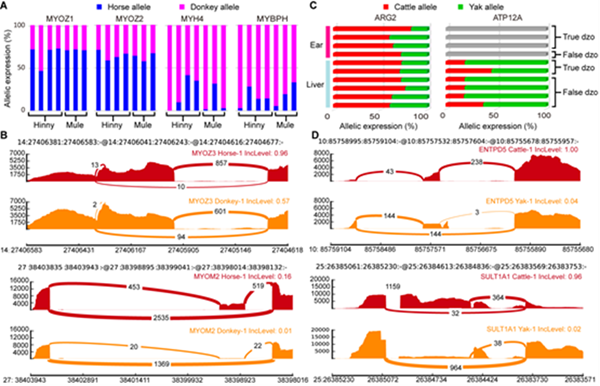 此外结果表明,肌肉调控相关基因 MYOZ1 、 MYOZ2 、 MYH4 、 MYBPH 为骡子中马和驴两等位差异表达基因,而 MYOZ3 、 MYOM2 为马和驴两等位差异选择性剪接基因。这些基因可能是马和驴肌肉力量差异的遗传基础。而在犏牛中,我们检测到两个低氧适应性相关基因 ARG2 和 ATP12A 是牛和牦牛两个等位差异表达基因。以及两个代谢相关基因 ENTPD5 和 SULT1A1 为牛和牦牛两个等位差异选择性剪接基因。这些差异可能导致了牦牛的高原适应性。因此通过近缘物种的杂种动物检测等位差异表达基因和等位差异选择性剪接基因可探究物种分歧和适应性进化的遗传基础。