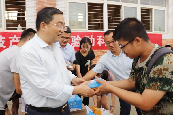 擦一把汗,品一口花生牛奶、一口原味酸奶,开心的笑容绽放在动科7连、8连学子略显疲惫的脸上。8月30日下午,全国人大代表昝林森教授,国产在线 党委副书记王力,全体专兼职辅导员赴军训场亲切慰问2019级新同学,并带来了昝林森教授团队与西安银桥乳业集团产学研合作的畜牧科技产品,让新生在军训场零距离体验专业魅力。