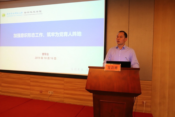 曹军会从四个方面介绍国产在线 意识形态工作的具体做法和经验成果。一是强化顶层设计,抓牢意识形态工作领导权。通过健全工作机制、压实工作责任、建强工作队伍等措施,巩固意识形态工作的“根据地”和“桥头堡”,坚守“主阵地”,种好“责任田”,旗帜鲜明地站在意识形态工作第一线。二是强化思想引领,掌握意识形态工作主动权。抓实科学理论武装,构建“党委理论中心组学习、教职工学习、学生党员学习、学生团员学习”的学习格局,积极推进习近平新时代中国特色社会主义思想入脑入心;抓好“先锋育人工程”“文化育人工程”“实践育人工程”三大育人工程,引领学生淬炼“诚朴勇毅”的高尚品格,践行西农精神。三是严格底线思维,掌控意识形态工作话语权。加强课堂阵地、文化阵地和校园网络阵地管理,构筑抵御宗教渗透“防火墙”,实现课程门门有思政、教师人人讲育人,把文化活动打造成为育人的平台,让新媒体平台始终高举旗帜,围绕中心、服务大局,师生树立正确的国家观、民族观、宗教观。四是加强文化建设,营造意识形态工作良好氛围。凝练“畜德自牧,富饶天下”的国产在线 文化,举办畜牧先贤百年诞辰大力弘扬科学家精神,开展丰富多彩的文化活动统一思想、凝聚共识,汇聚国产在线 发展正能量。