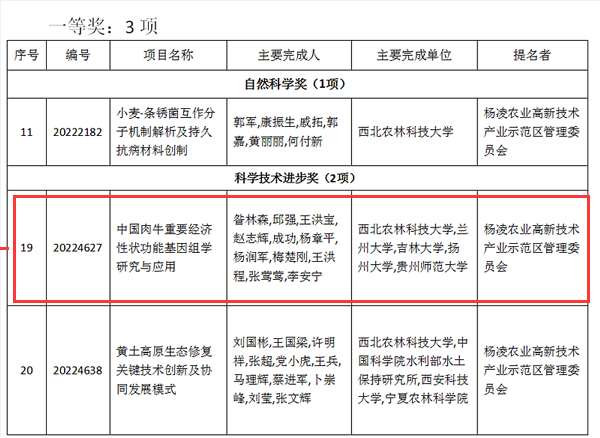 近日,陕西省人民政府下发了《关于2022年度陕西省科学技术奖励的决定》,全省共授予260项科技成果和8名科研人员省科学技术奖励,其中,学校有12项科技成果获2022年度陕西省科学技术奖励,其中一等奖3项、二等奖7项、三等奖2项。动科国产在线 有2项科技成果获奖,昝林森教授牵头完成的《中国肉牛重要经济性状功能基因组学研究与应用》荣获陕西省科学技术进步奖一等奖,王高学教授牵头完成的《杀灭鱼类单殖吸虫天然活性分子的发现、作用靶点及构效关系研究》荣获陕西省自然科学奖二等奖。