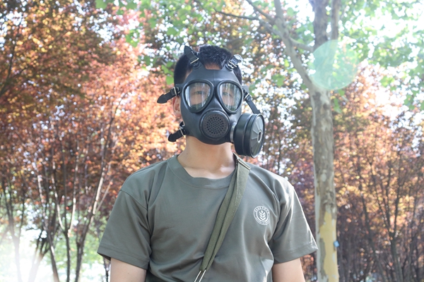 教官演示佩戴防毒面具